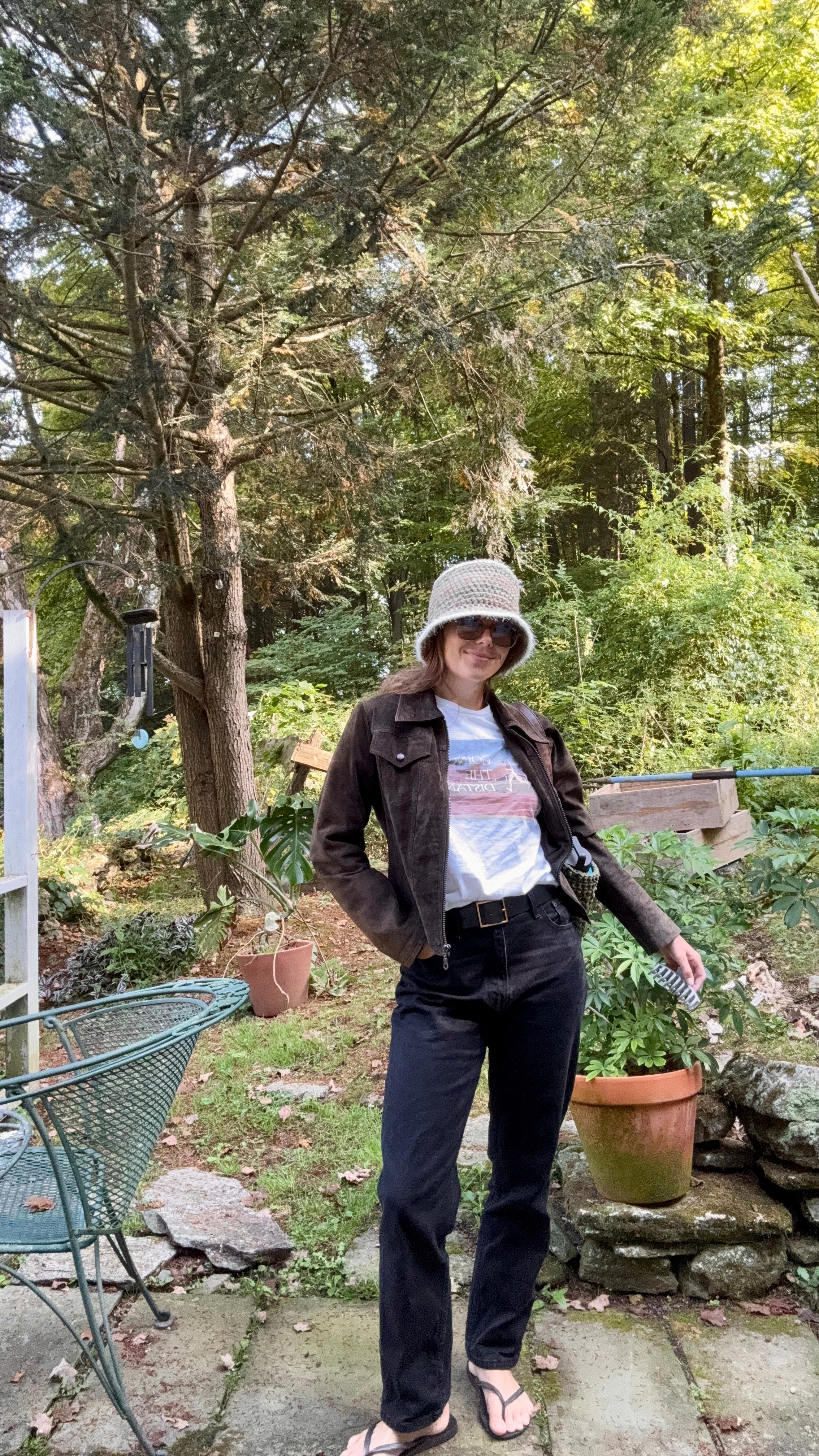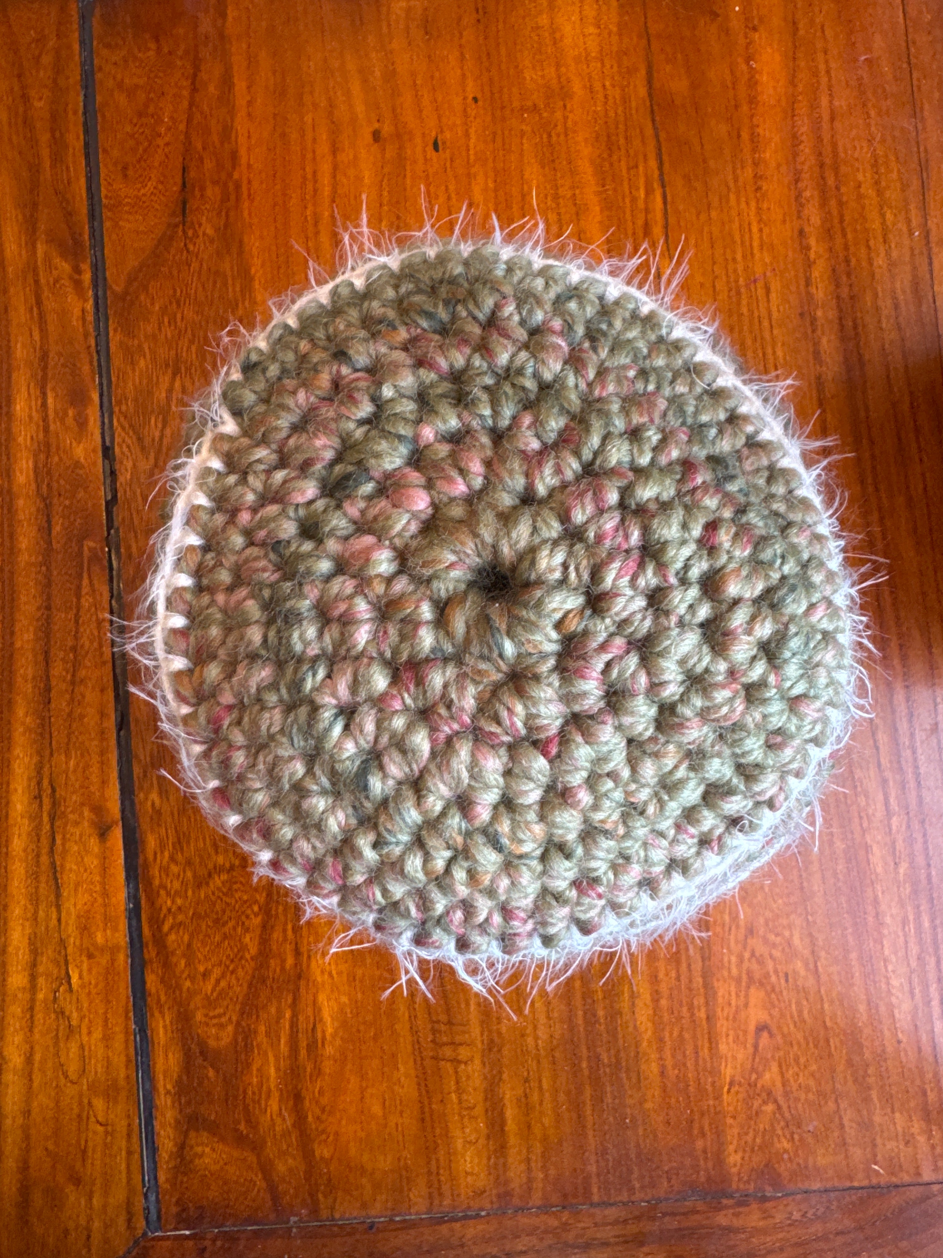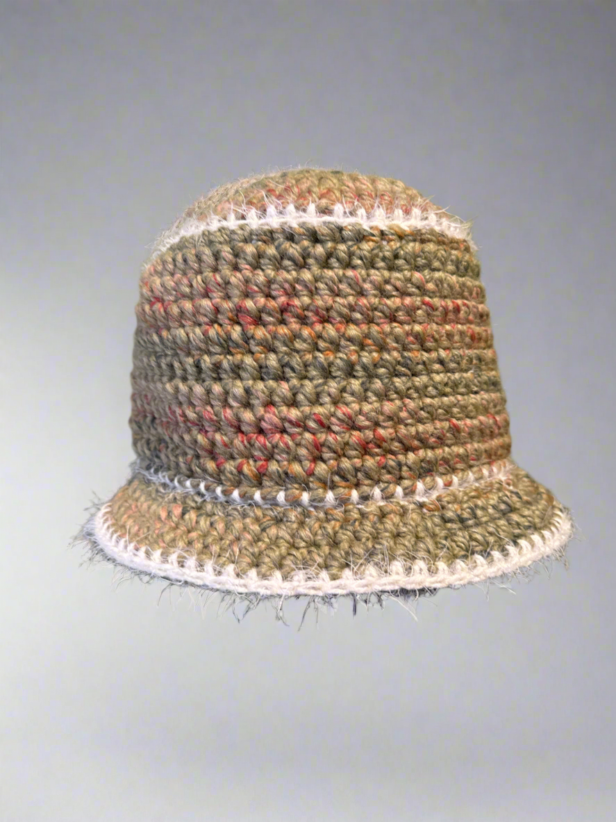 Hand-crocheted bucket hat made with a wool blend and fuzzy white yarn. Earthy neutral tones. Hand wash, air dry