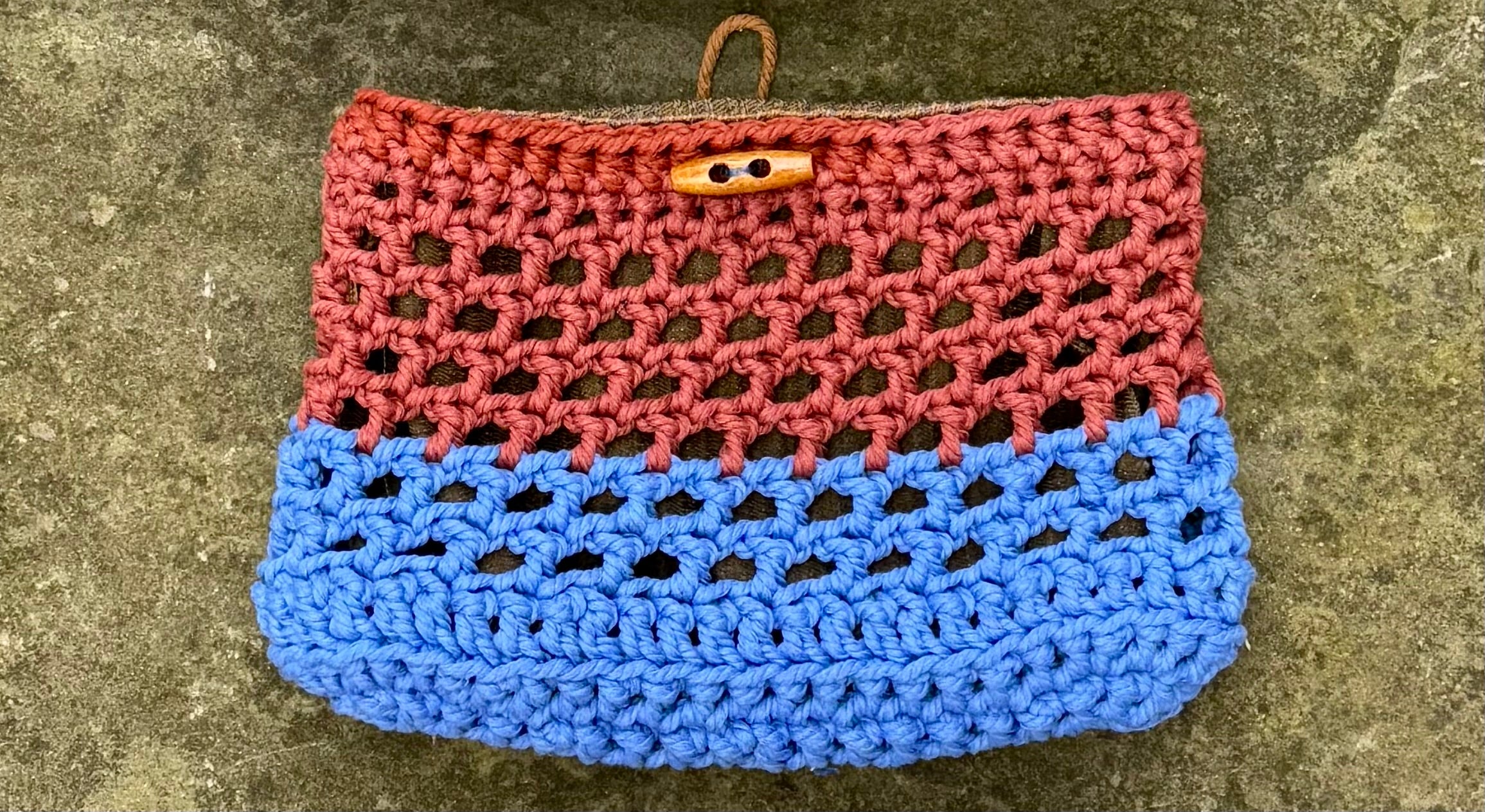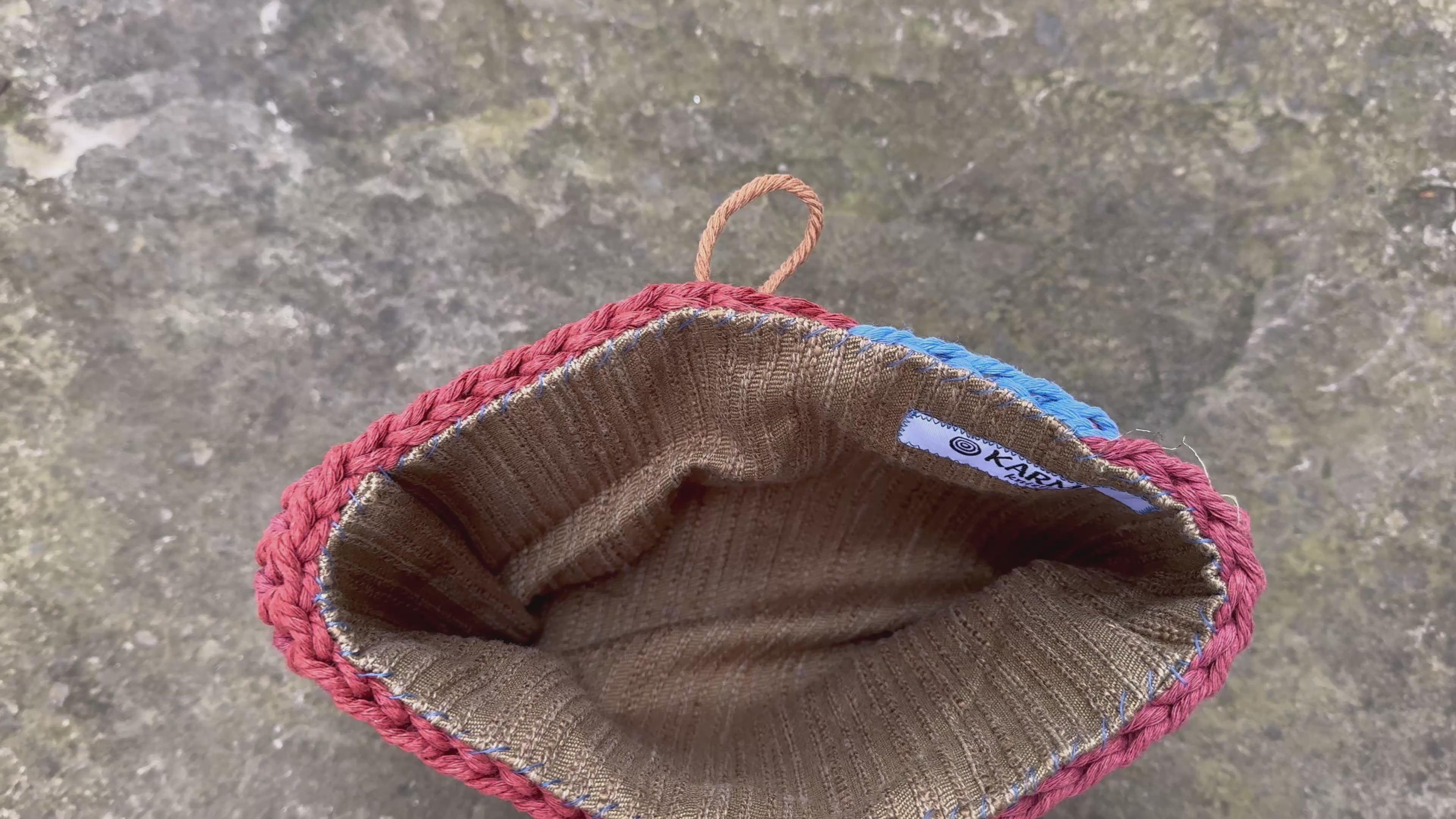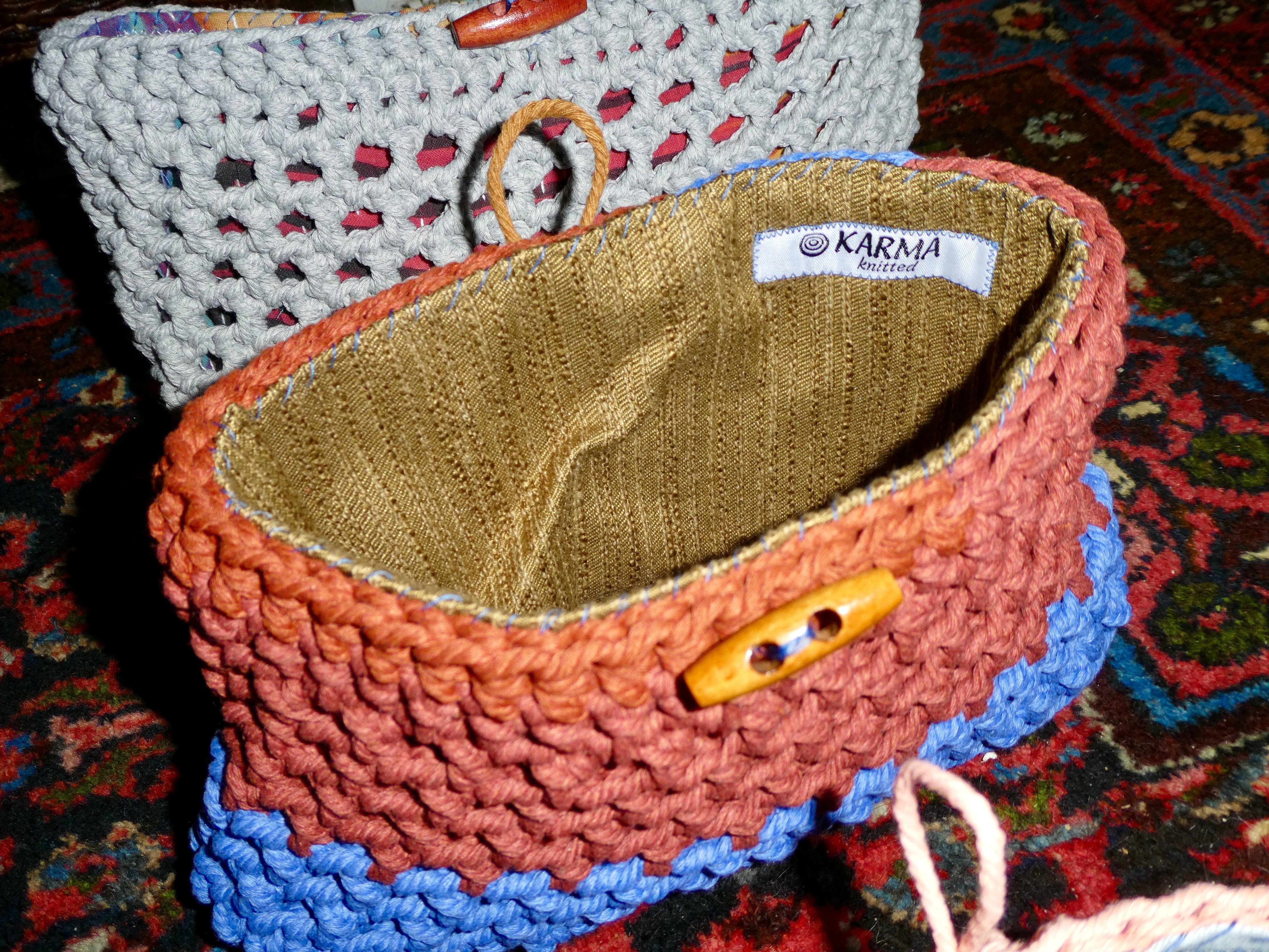 Made with organic cotton, lined with a ribbed green upholstery fabric and fastened with a wooden toggle