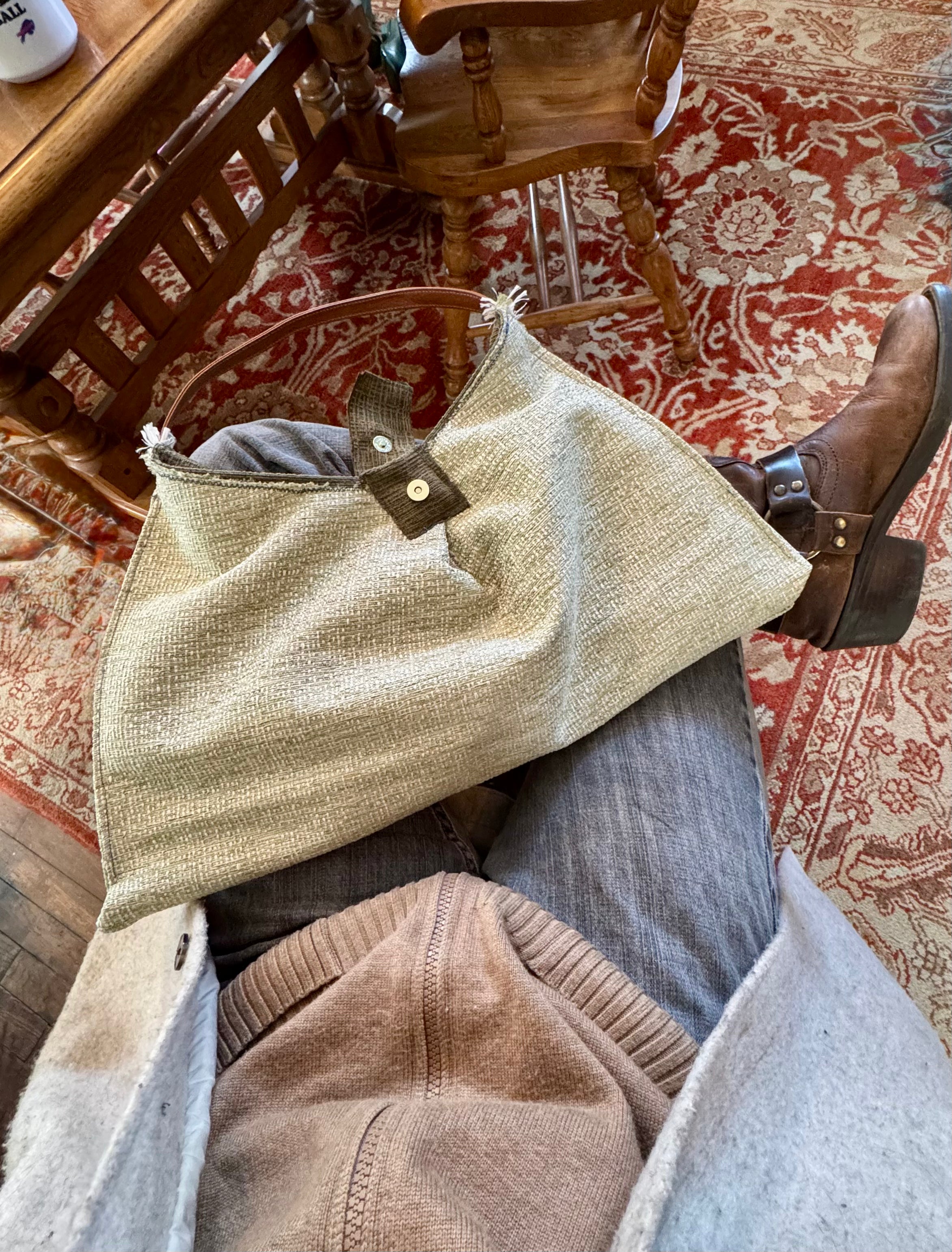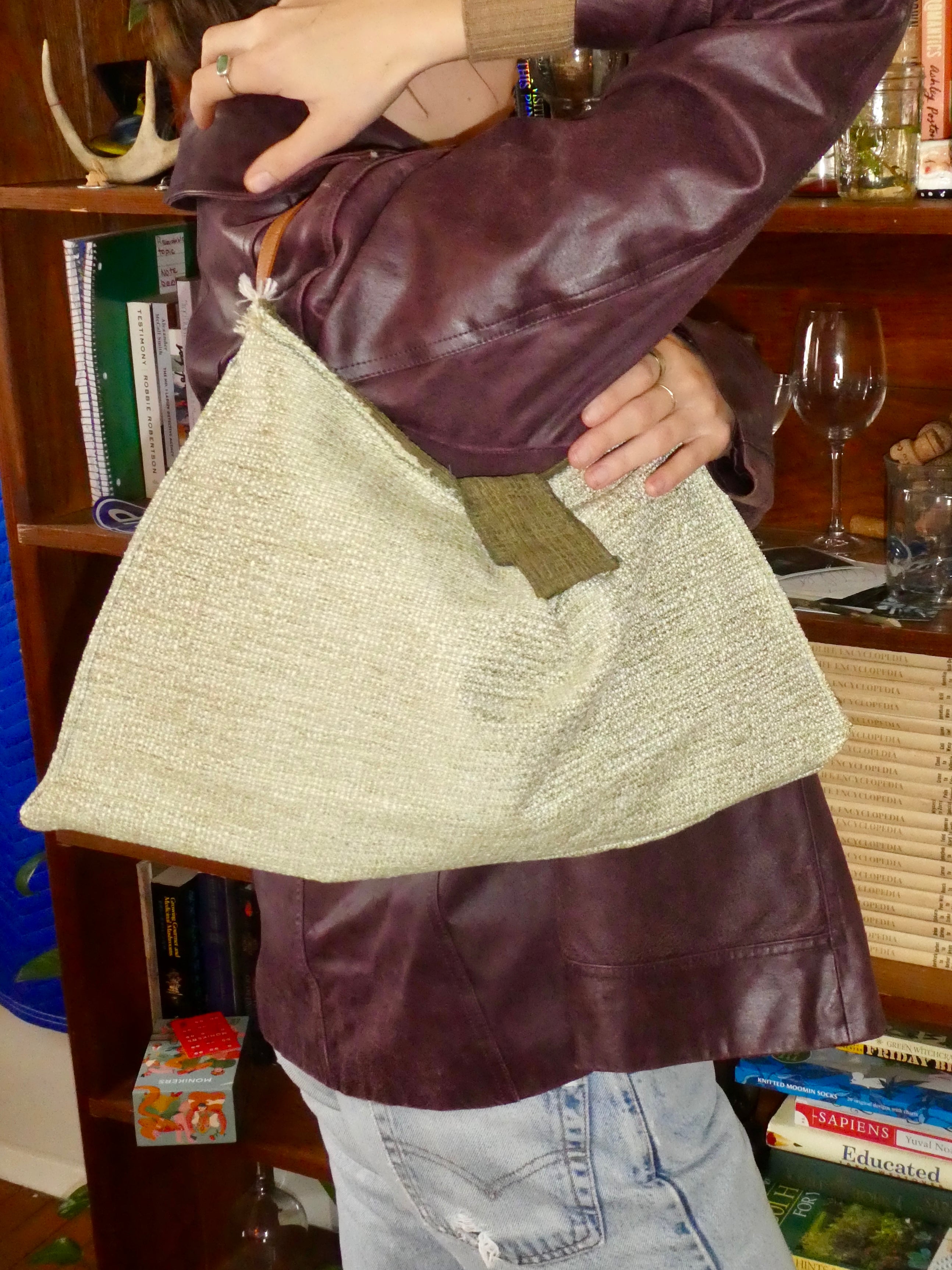 Made with a textured sage fabric that gives a soft woven look. Leather strap, olive lining inside, and a little metallic clasp to finish it off….