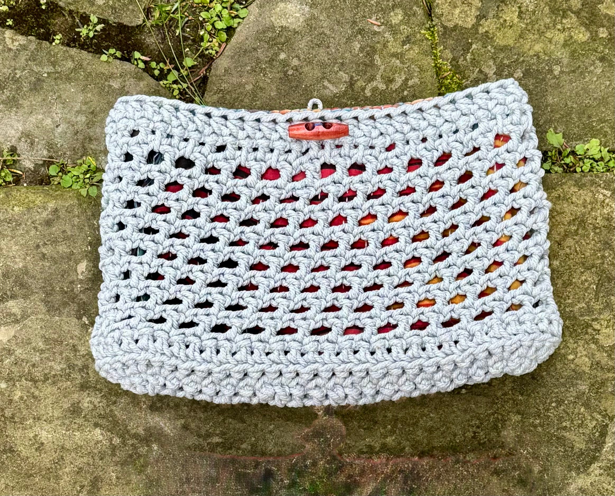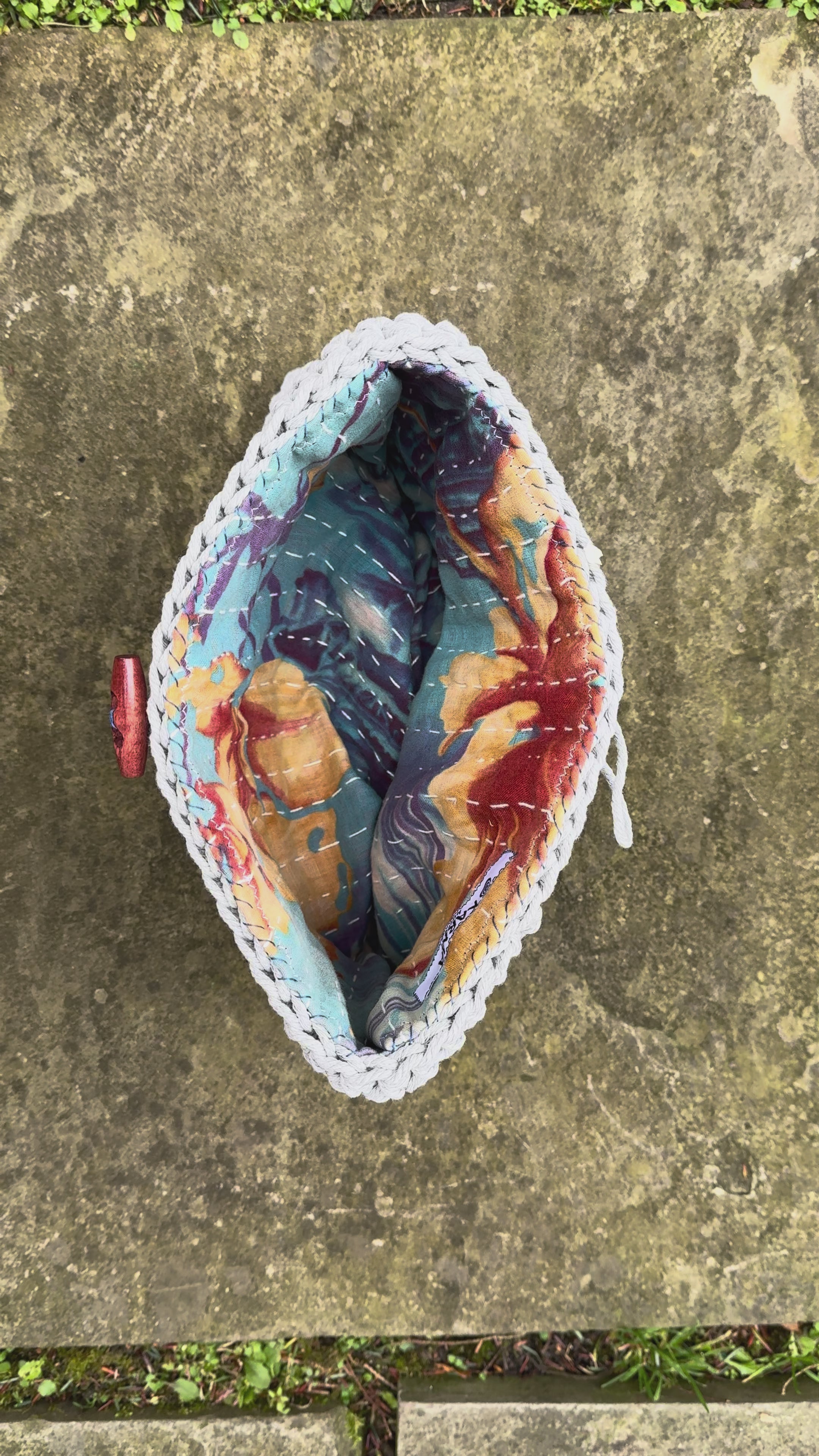 Made with gray organic cotton, lined with Kantha and fastened with a wooden toggle